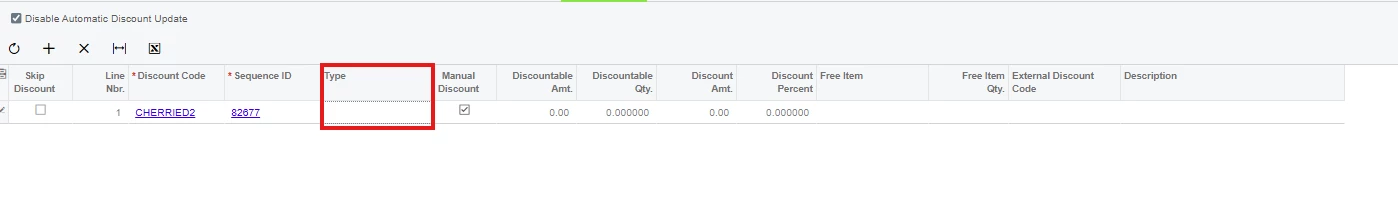 I am creating the discount code, and it is being created correctly — all the data is saved properly in both the header and the details. However, when I try to apply it to a sales order, the discount code is not applied: the sequence ID is not generated automatically, and when I set the sequence ID manually, the type is not set. By contrast, if I create the same discount manually and apply it to a sales order, all the fields are saved correctly.