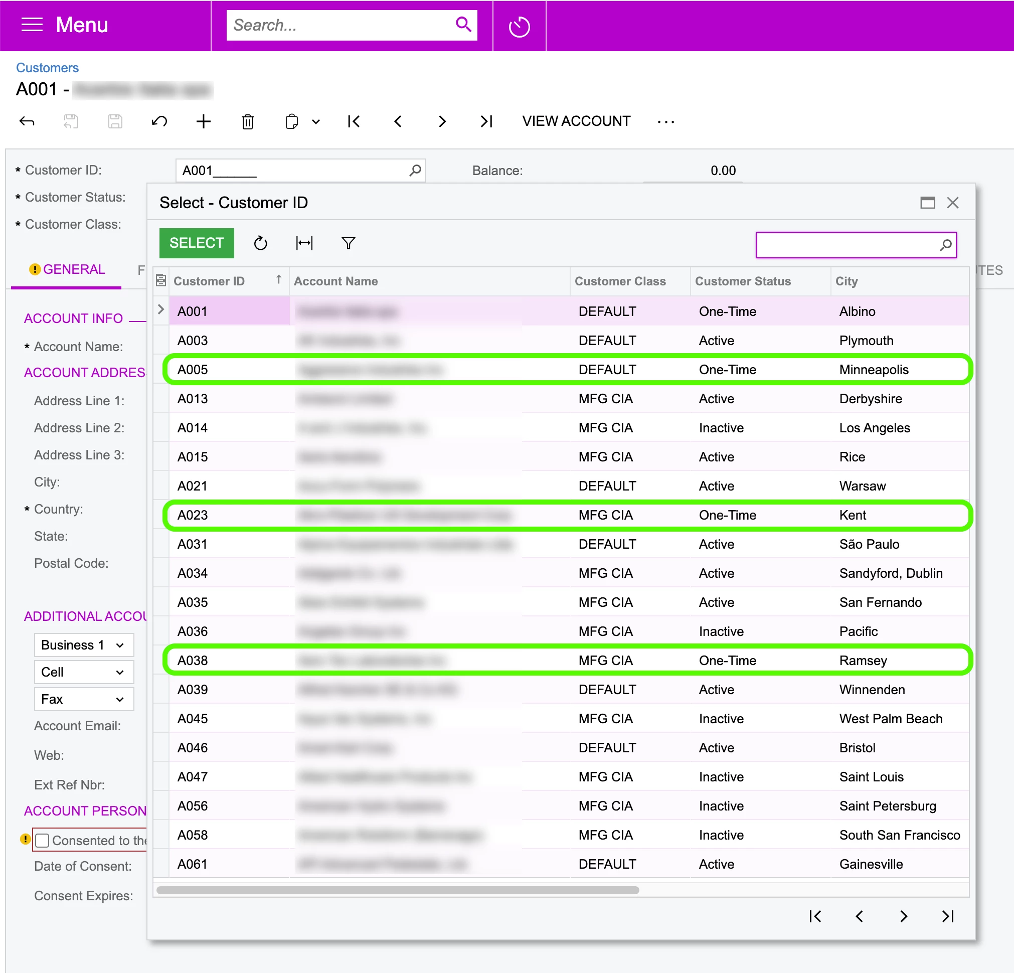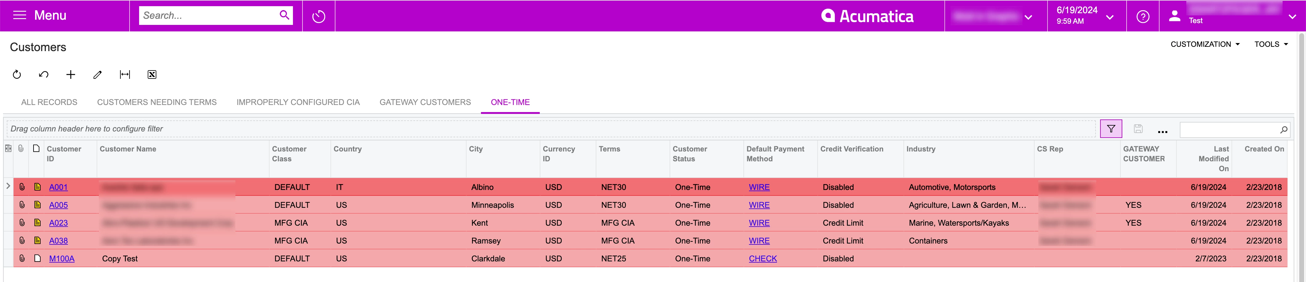 But I would like a similar formatting in all Customer selection dialogs, like in the screenshot below. It would be great for our customer service reps to see One-Time customers highlighted red in dialog selections: