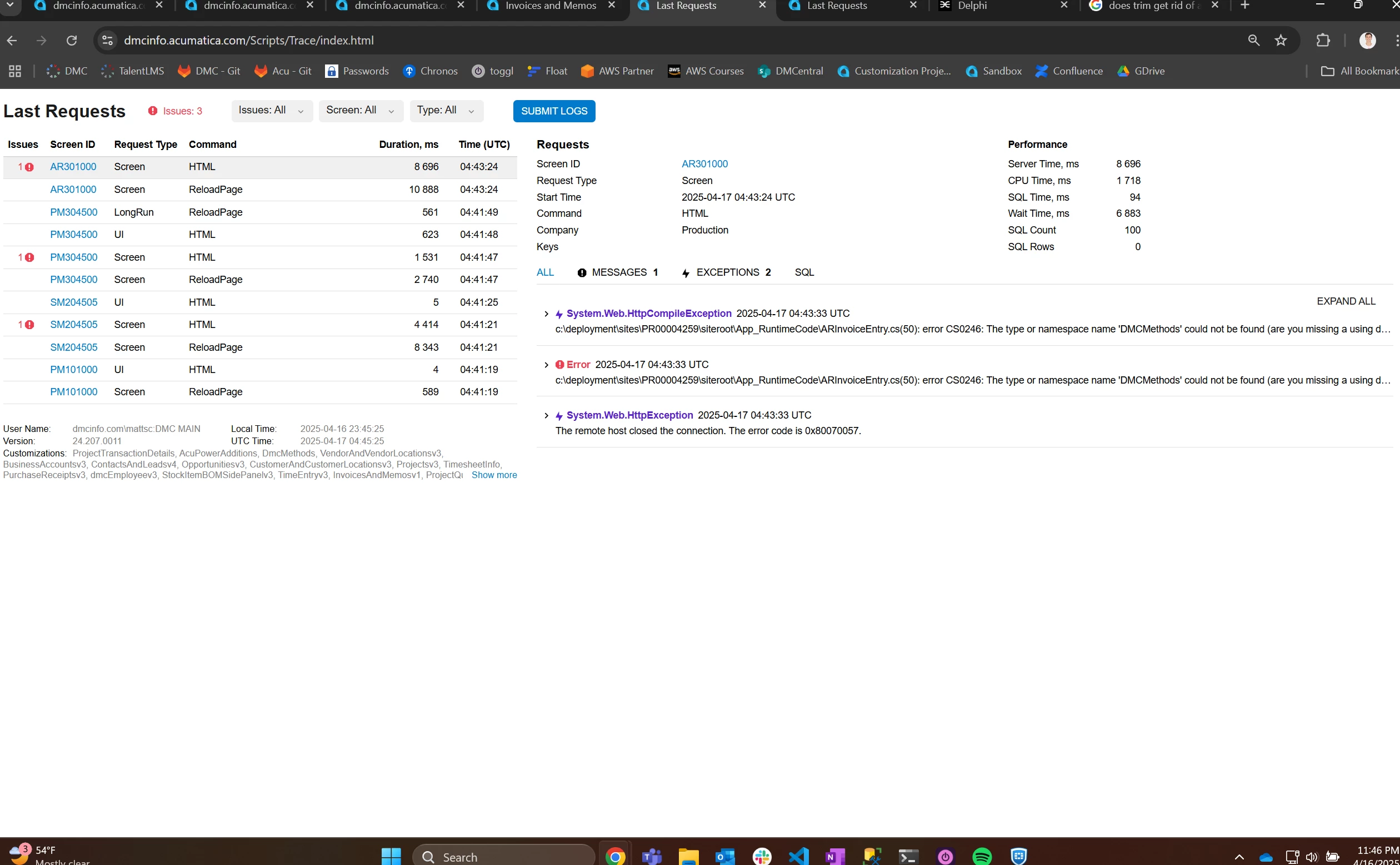@mattsc Usually this happens in case some .dll or file in the App_RuntimeCode folder is not valid. From what I see on your Trace screenshot you probably missed namespace in the ARInvoiceEntry file.