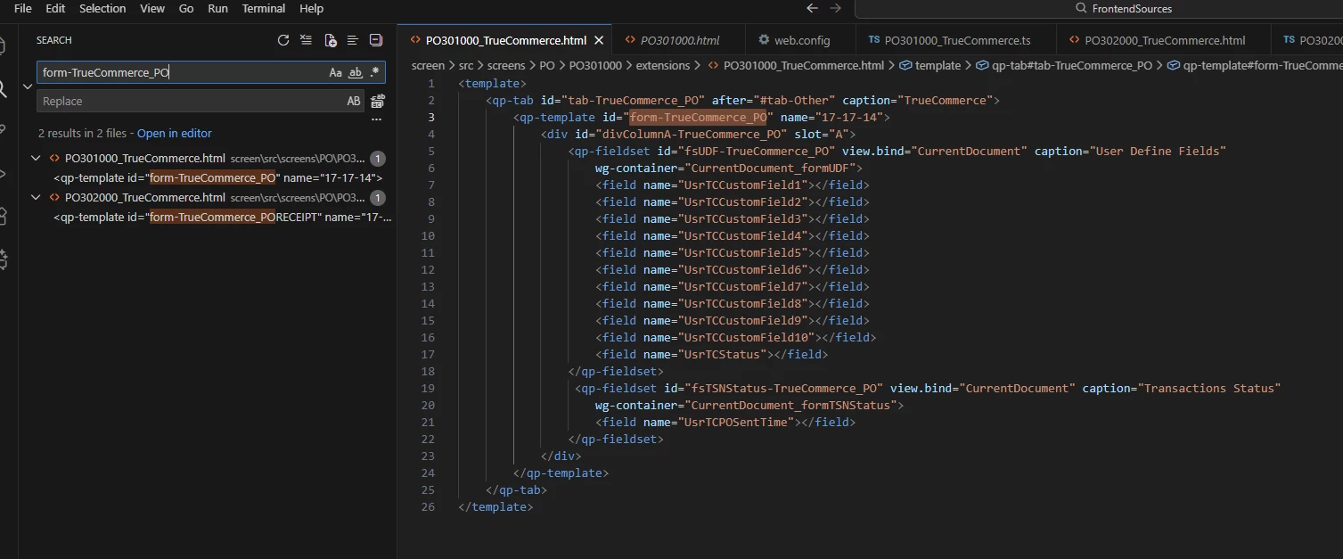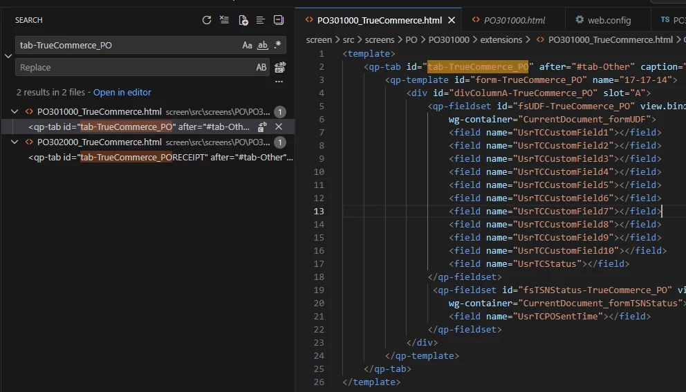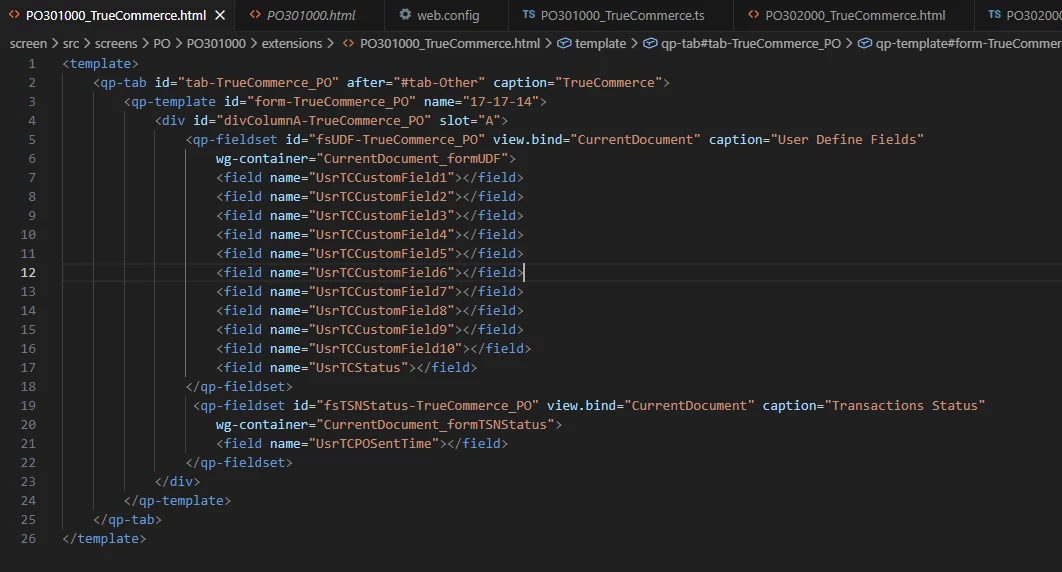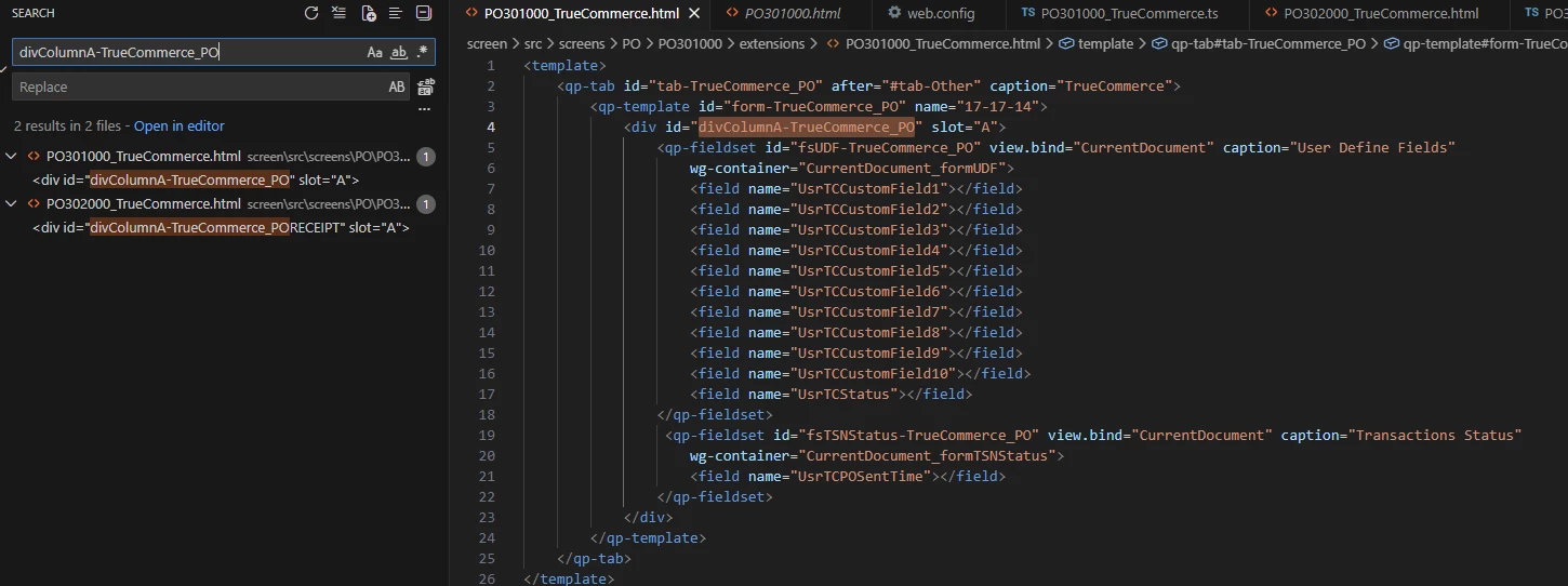 Error occured during HTML merge for 'PO301000', original source will be used instead. Error: Error: Element ids are not unique: id=tab-TrueCommerce_PO tags=QP-TAB,QP-TAB; id=form-TrueCommerce_PO tags=QP-TEMPLATE,QP-TEMPLATE; id=divColumnA-TrueCommerce_PO tags=DIV,DIV; id=fsUDF-TrueCommerce_PO tags=QP-FIELDSET,QP-FIELDSET; id=fsTSNStatus-TrueCommerce_PO tags=QP-FIELDSET,QP-FIELDSET