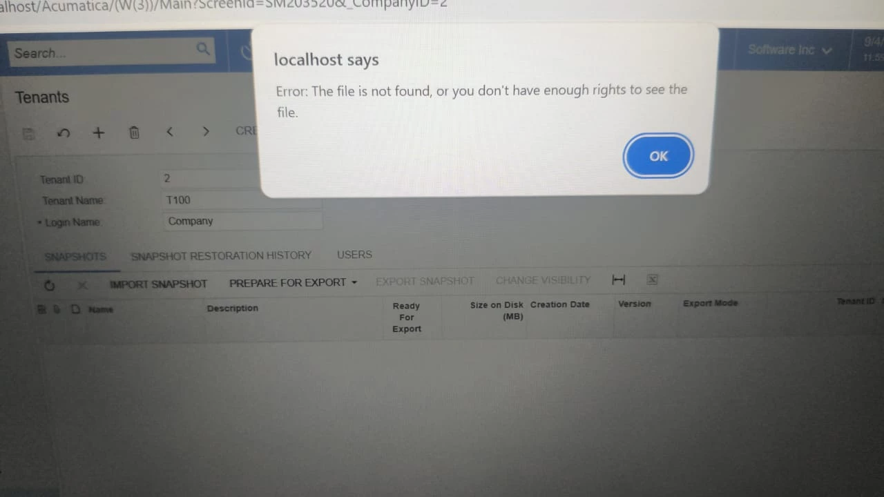 Error: The file is not found, or you don't have enough rights to see the file, Import Snepshot