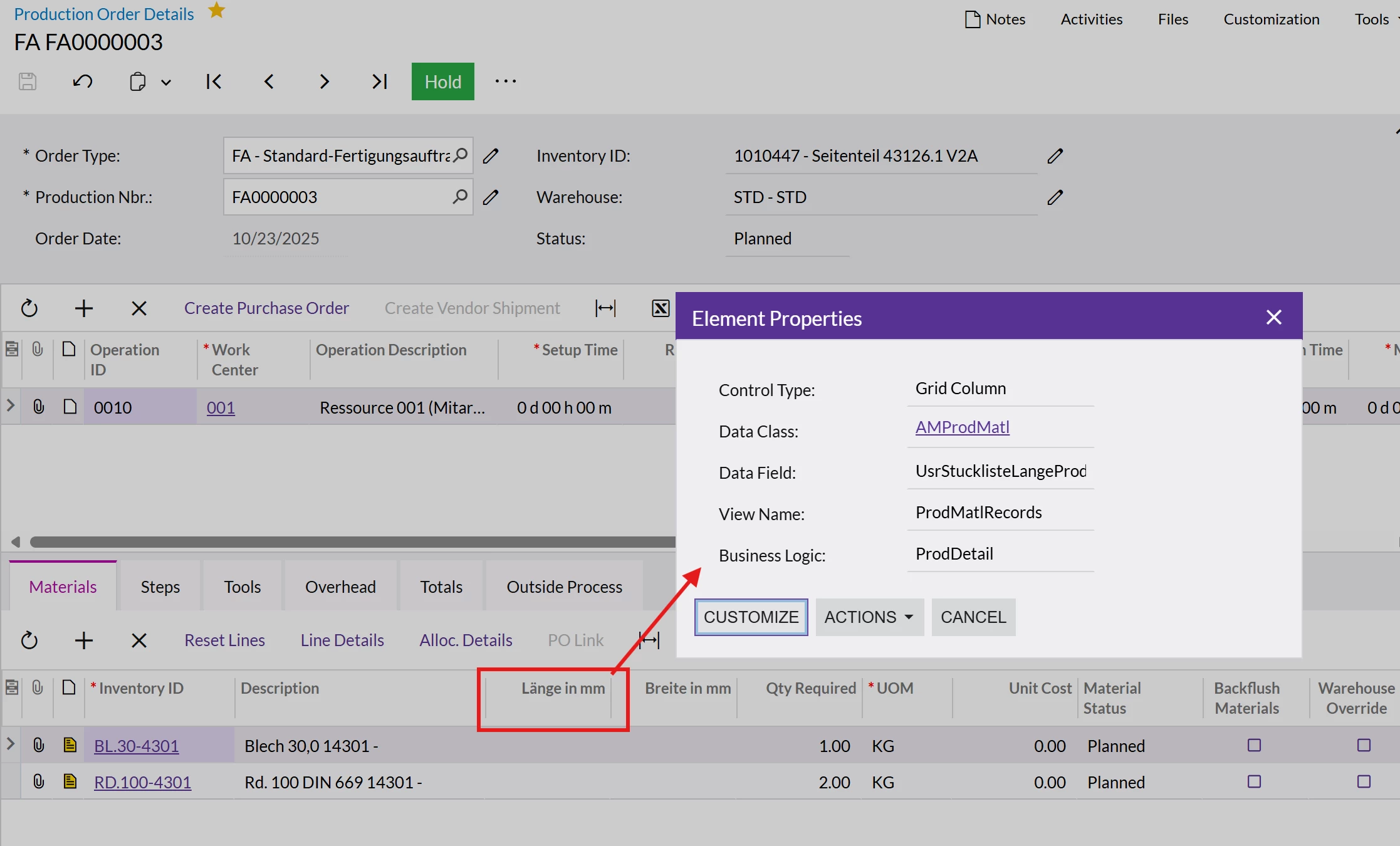 I had to override the CopyBomToProductionDetails method in a ProdMaint graph extension — that’s the exact function Acumatica uses to copy data from BOM to Production Order. After calling the base method, I looped through the material lines, matched each one to its BOM counterpart using OperationID and item keys, copied the custom fields, and updated the record. Now it copies perfectly every time.
