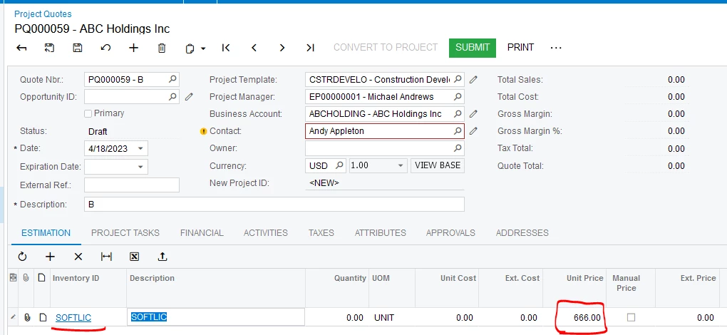 The screen shot above shows that when SOFTLIC was entered the unit price was defaulted to 666.00