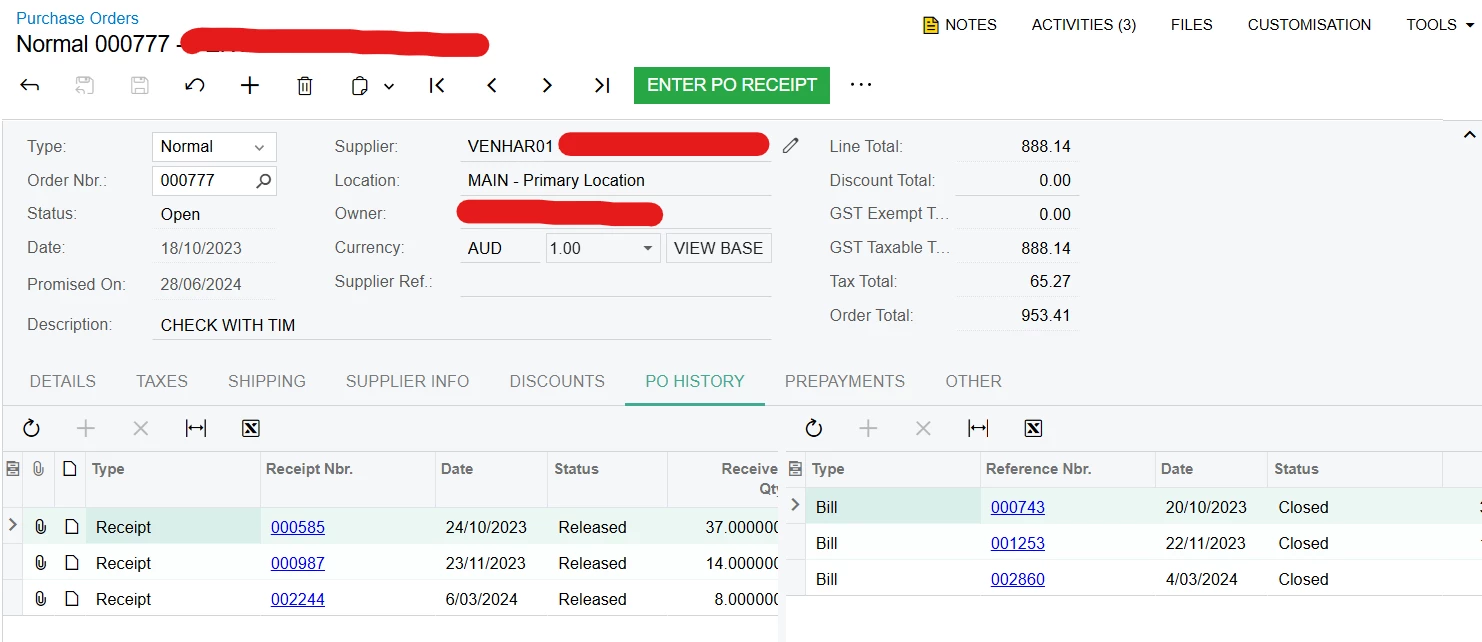 A client is having an issue where purchase receipts have been created for a purchase order, and it is fully receipted, but the purchase order is not able to be closed as it is still thinking it needs to be receipted, as shown in the image below.