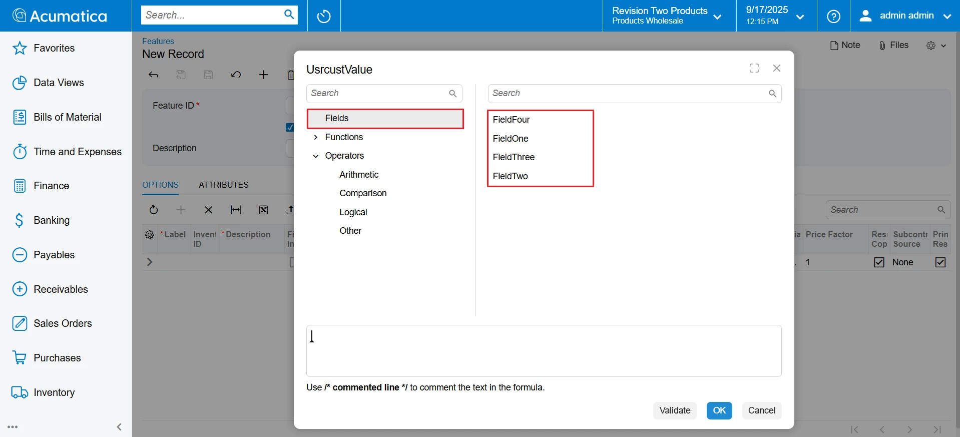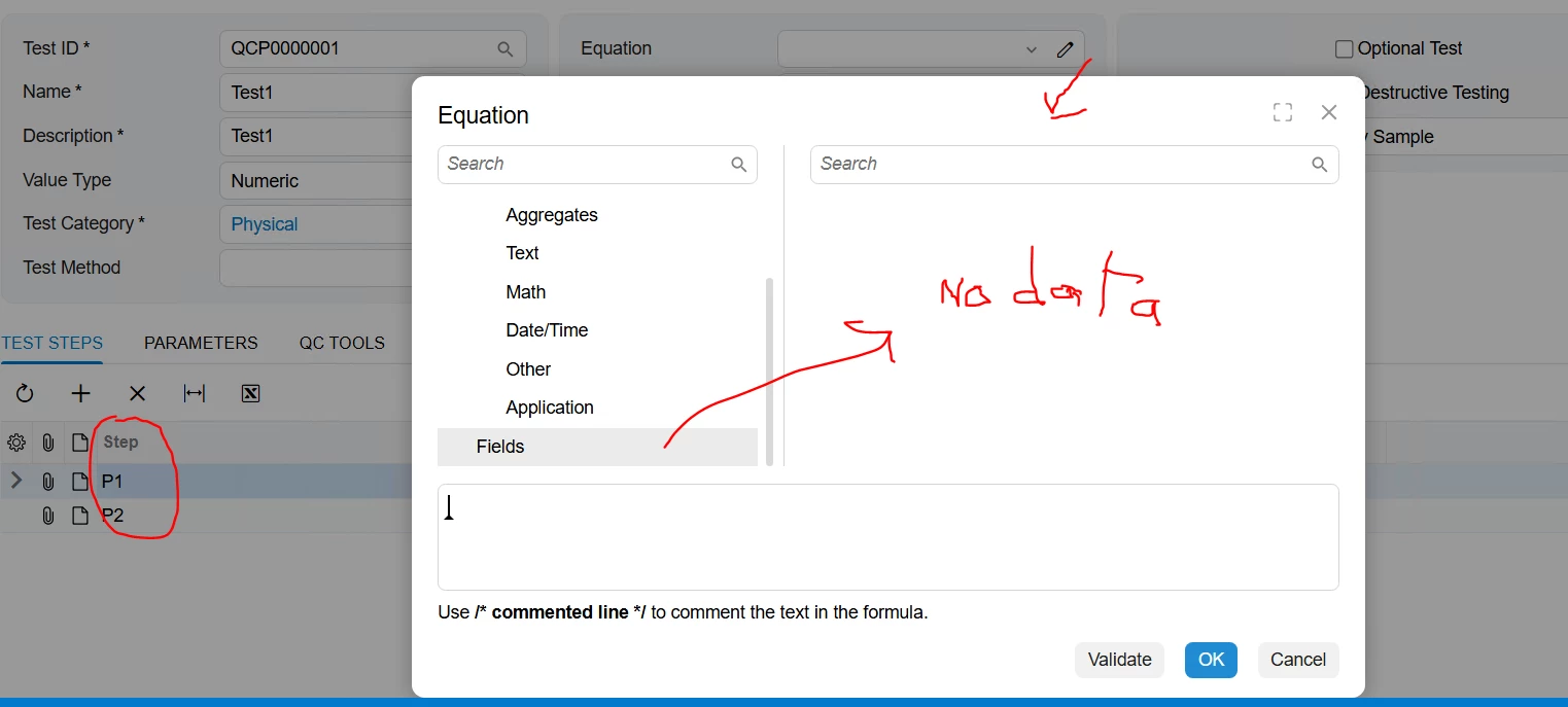 Similarly, after converting the screen to Modern UI, the Fields node in the formula editor popup does not display the data added in the Parameters tab like