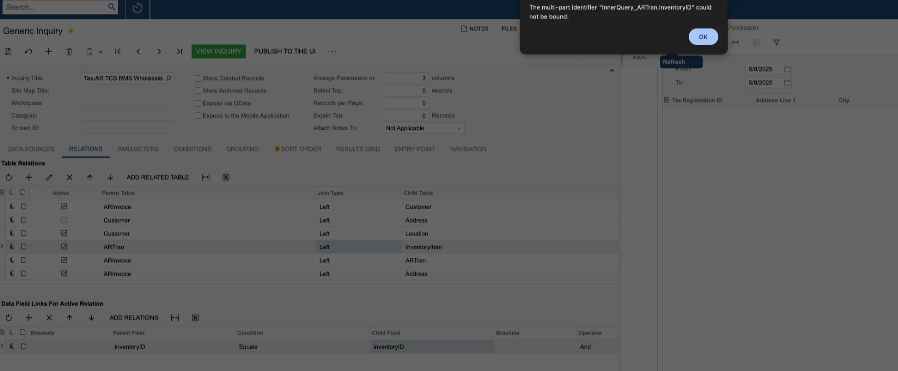 Hi, There is and GI Tax-AR TCS RMS Wholesaler. When i active the artra.invenotry id and inventoryitem.inventory id its giving me below error.