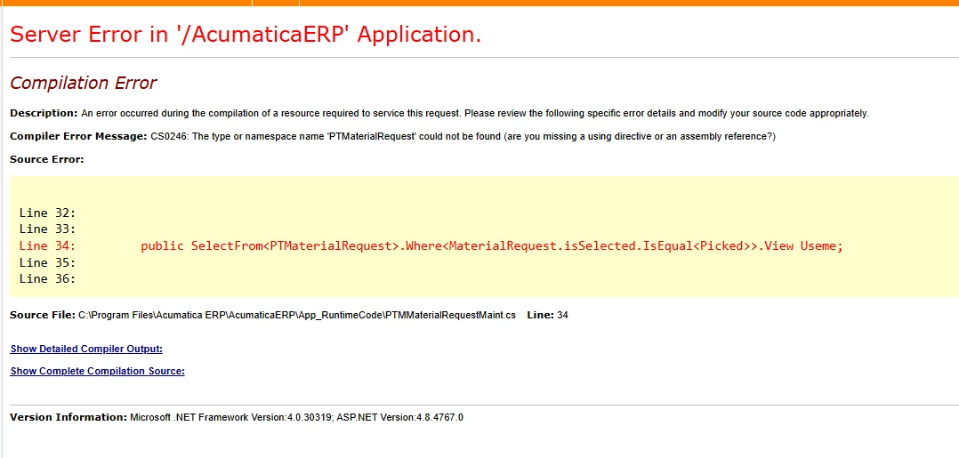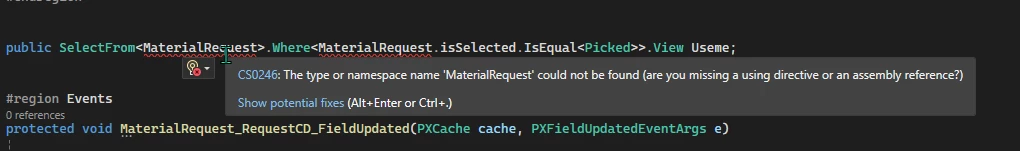 I am trying to add an action to a custom screen. I want to add another view to be used in that action, but for some reason, The pxselect is not referencing my table. anyhwere that i write my table name, it doesnt recognize it. i do have a class in the dac with that name, but it doesnt recognize it for some reason. without the action, the screen works fine using it but if i try to create another view for the action it doesnt work and will error out. Can anyone tell me how to fix this? I created the initial screen following along to the T200 series videos.