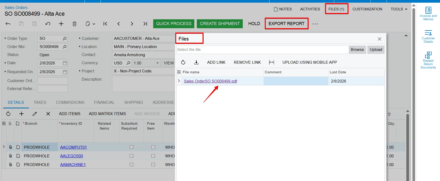 When the custom “Export Report” action is clicked, a PDF is generated from the SO641010 report and attached to the Files section of the Sales Order: