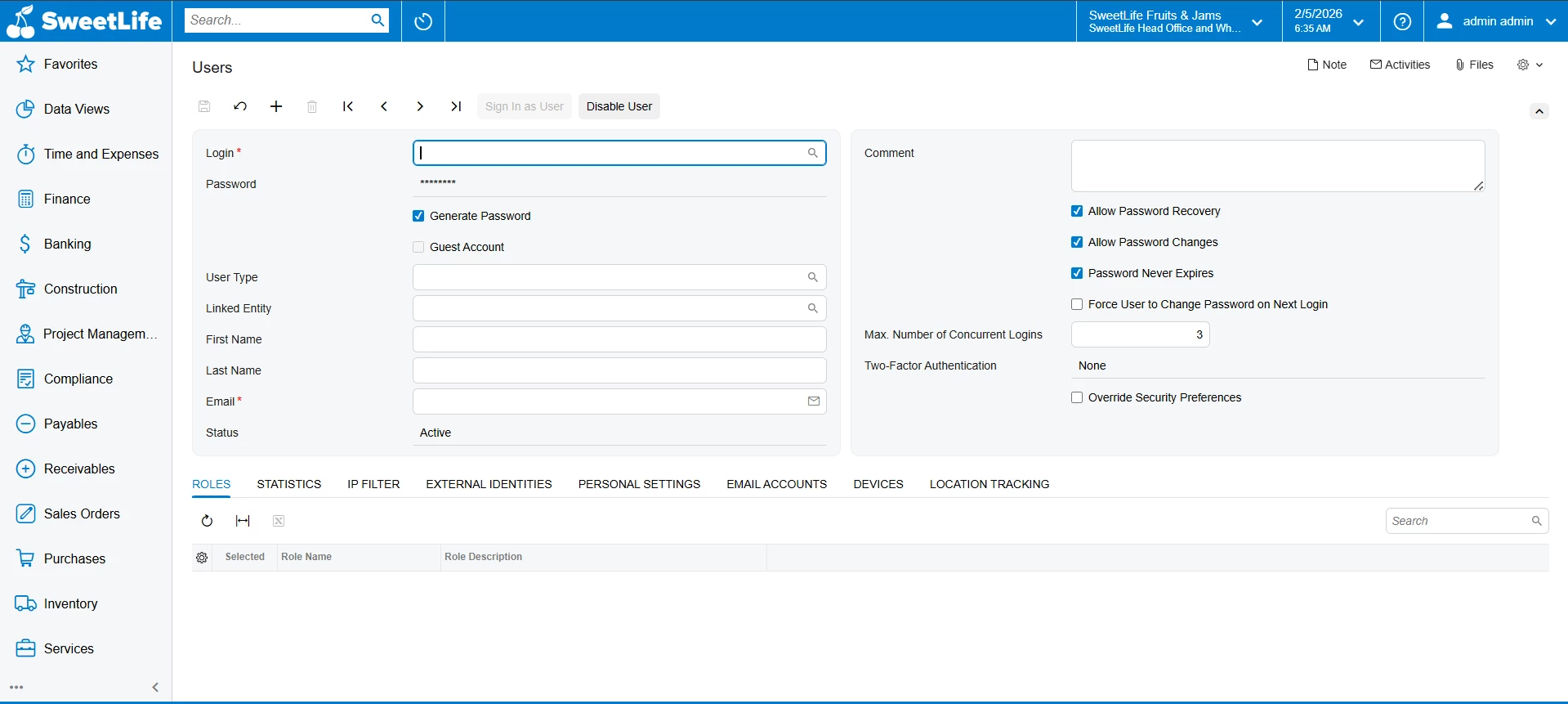 Branch access settings under Users (SM201010)