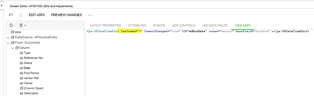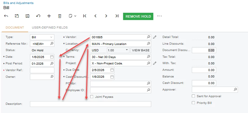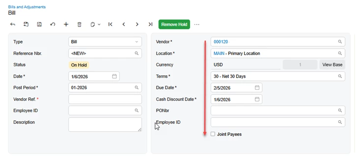 Currently, in the classic 25R2 interface, when a user creates an accounts payable invoice, the FIRST field they enter is "Vendor." Then, using the TAB key, they cycle through each field following the specific procedure we've requested. From "Vendor," the TAB key goes to "Date," then to the left, then to "Location," and finally to the middle column. See the image below of the classic 25R2 interface.