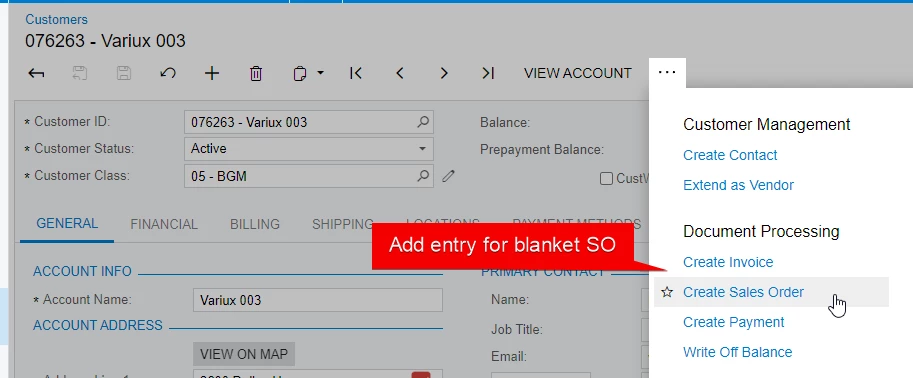 How do I create a shortcuts for Create Blanket Sales Order on the Sales Order Menu and on the Customers three dots menu? I’m trying to easily go from creating a customer to creating a blanket sales order in a single click.