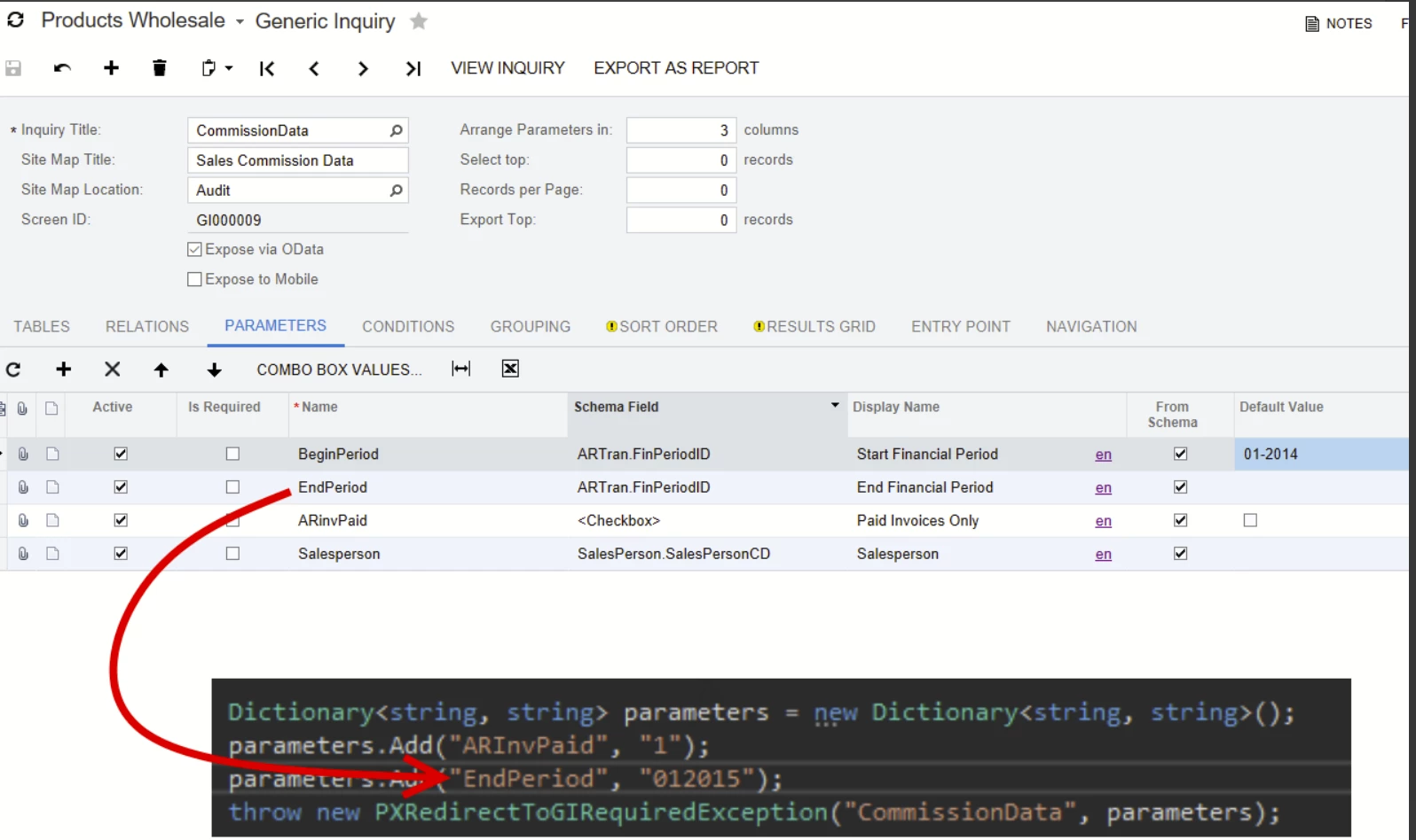 PXGenericInqGrph giGraph = PXGenericInqGrph.CreateInstance("CommissionData", "CommissionData", giParameters);