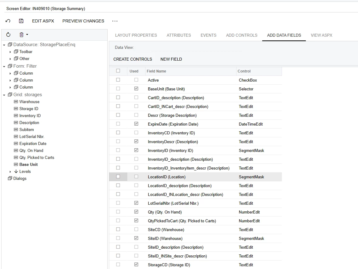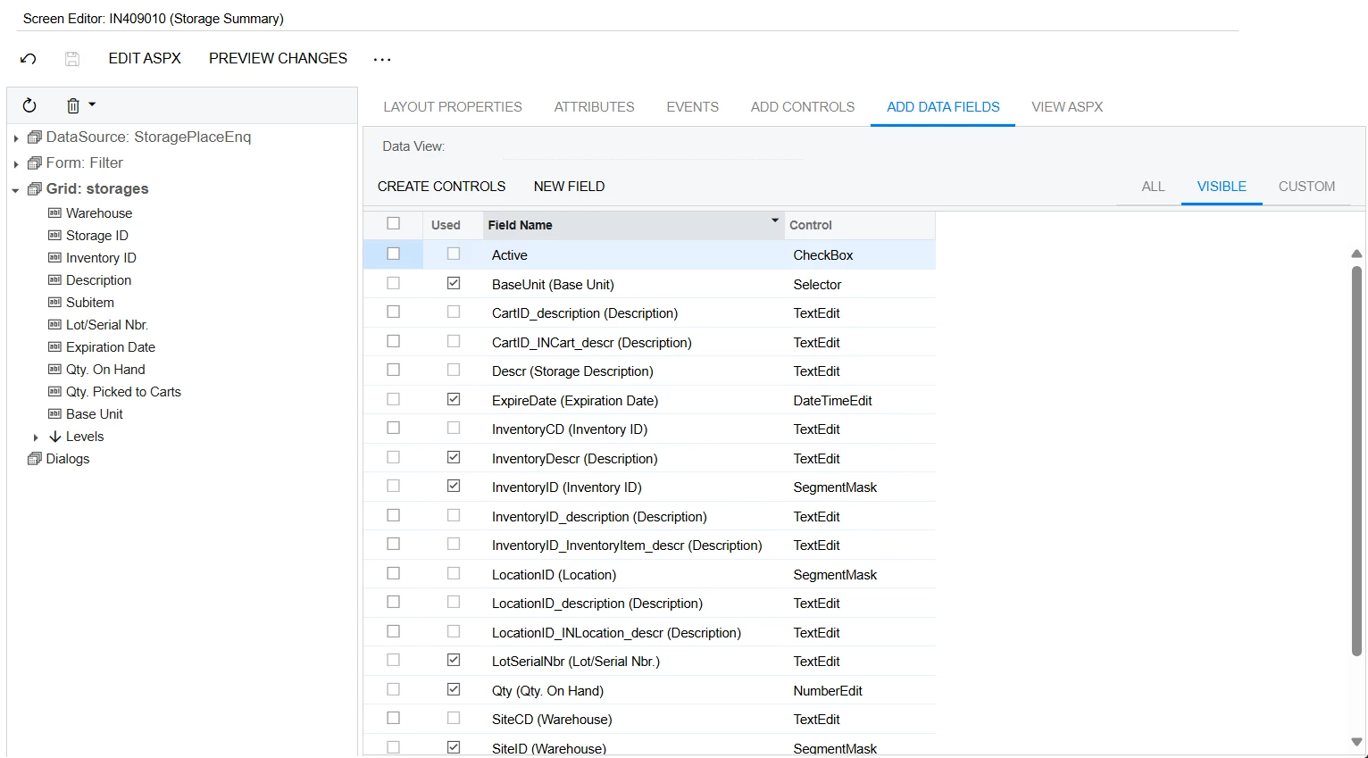 • The Storage Summary screen will now open in the Customization Editor, where you can add new columns or make other changes.