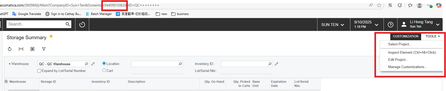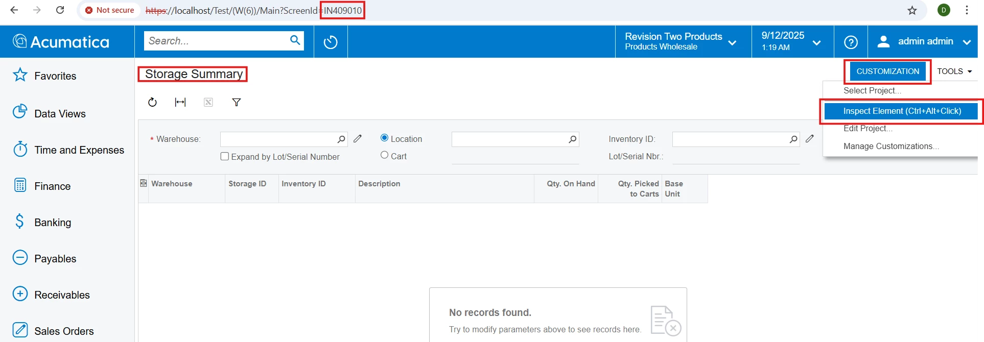 When I click on CUSTOMIZATION, it shows the options below, but none of them allow me to open IN409010 for editing.