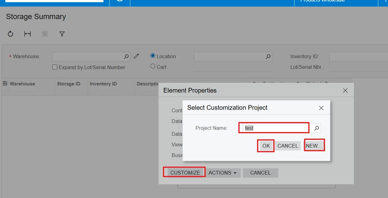 When you click on Customize, the system opens screen SM204520 (Customization Projects). This means you will need to either select an existing project or create a new one if no projects are available.