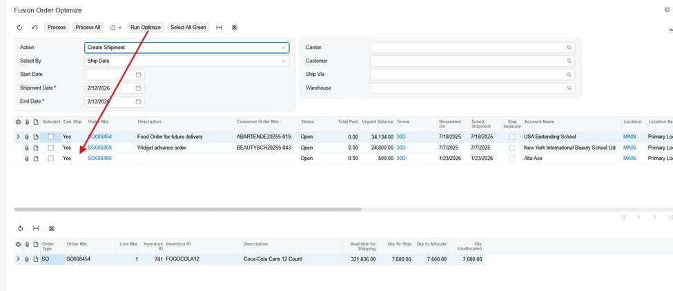 In the Classic screen, I use an action to highlight (change the row color of) records in the grid based on the value of the UsrFRCanShip field. When I click the action, the row colors update as expected (see the screenshot below).