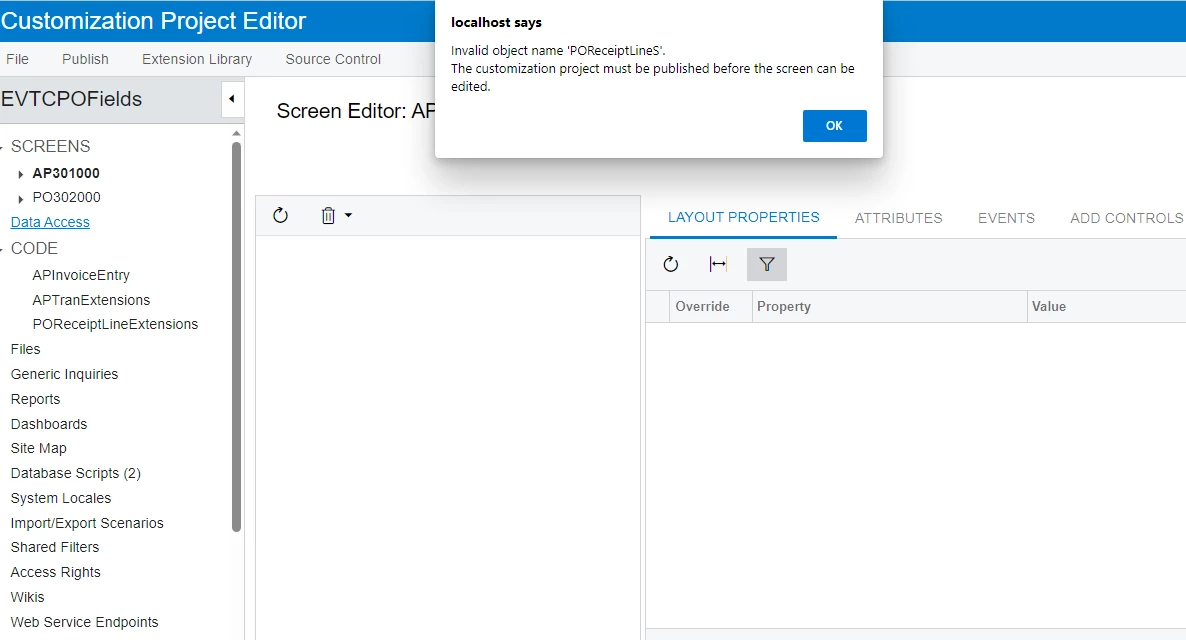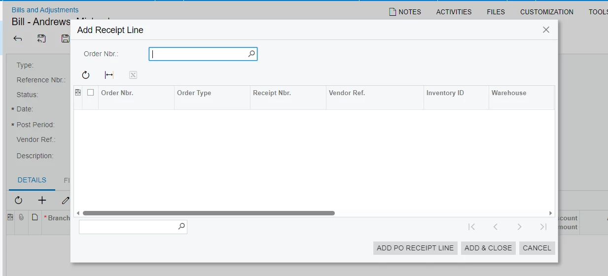 I have 2 custom fields on the purchase receipt line and in Bills and adjustment line, I want those fields in the Dialog of the ADD PO RECEIPT LINE button in the Bills and adjustment screen, retrieve the information and apply it on the Bills and adjustment line.