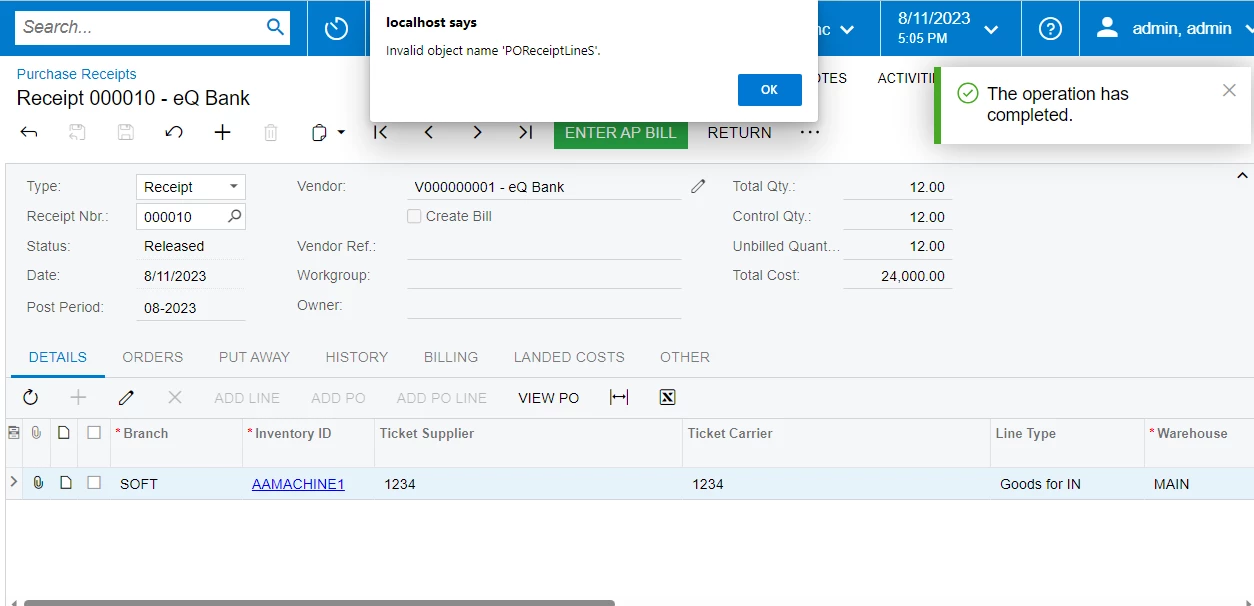 I can release the purchase receipt but I can't get the data in the Bills and adjustment.