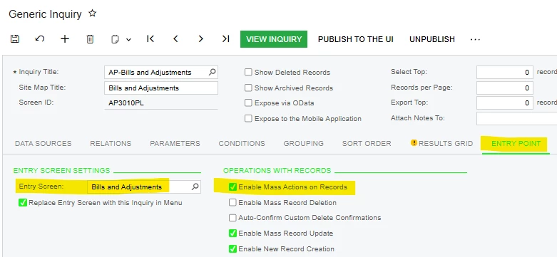 Navigate to the Entry Point tab, and ensure Bills and Adjustments is set as the Entry Screen, and tick Enable Mass Actions on Records. Based on the actions already available to you, this is probably already set up:
