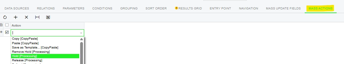 Then navigate to the Mass Actions tab. Here, you can select the Actions available on the selected Entry Screen, which includes Hold. You probably already have Remove Hold and Release in there already: