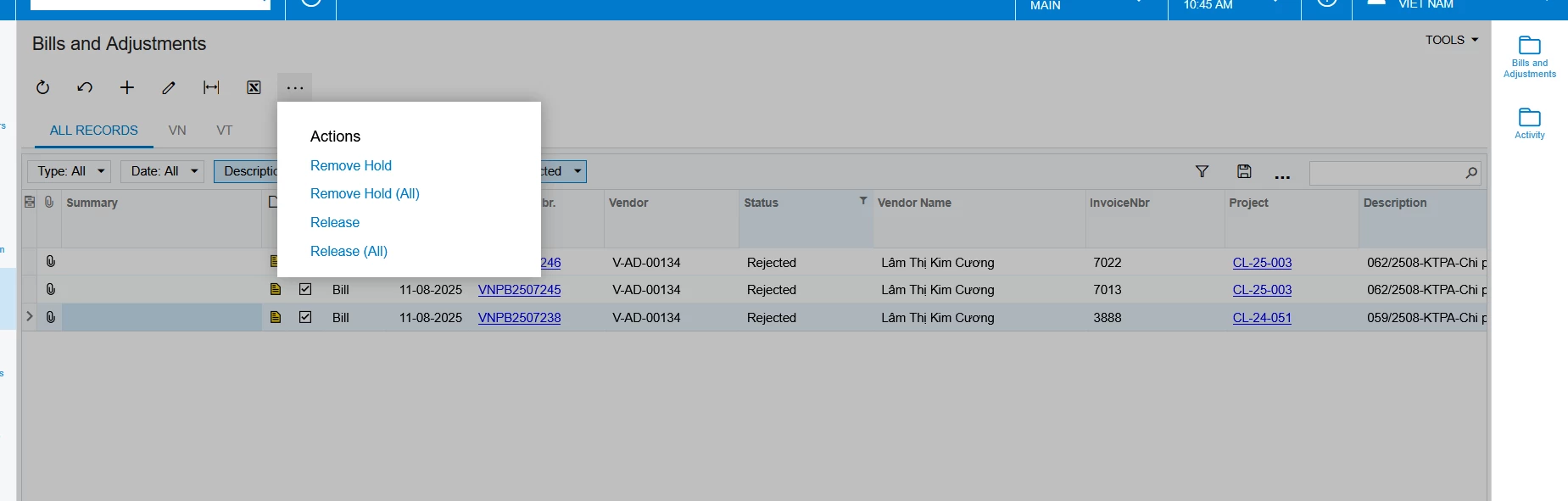 Hi, I’m new to acumatica. I want to know if I can add a ‘Hold’ action to this in Bills and Adjustments? If yes, how can I do that? Thank you