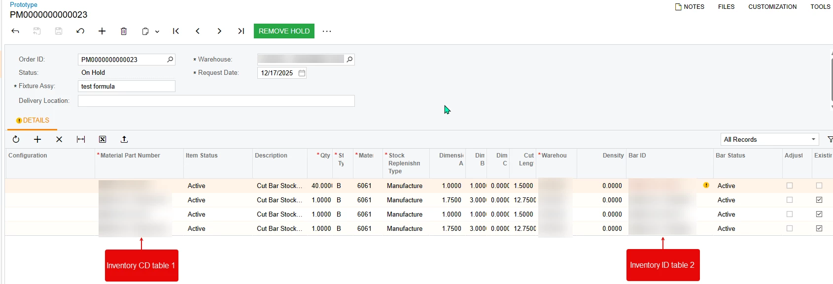 notes- the material id field is a free form text field so i have to use inventorycd for it. the barid field uses inventoryid in the table.