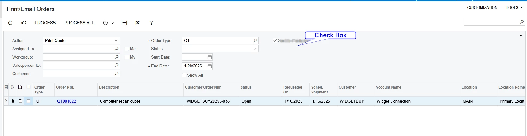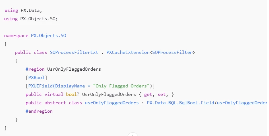 In the Print/Email Orders screen, I want to add a custom filter checkbox. I have already have a custom checkbox field in the SOOrder table. If the filter checkbox is checked, then only Sales Orders with this custom flag records should load; if unchecked, all records should load.