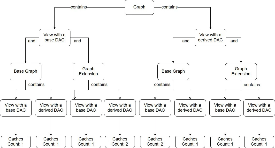 - If the view with the base DAC is declared first in the graph, there are two caches (one for the base DAC and one for the derived DAC). For each DAC, cache mapping points to its own cache with the same cache item type.
