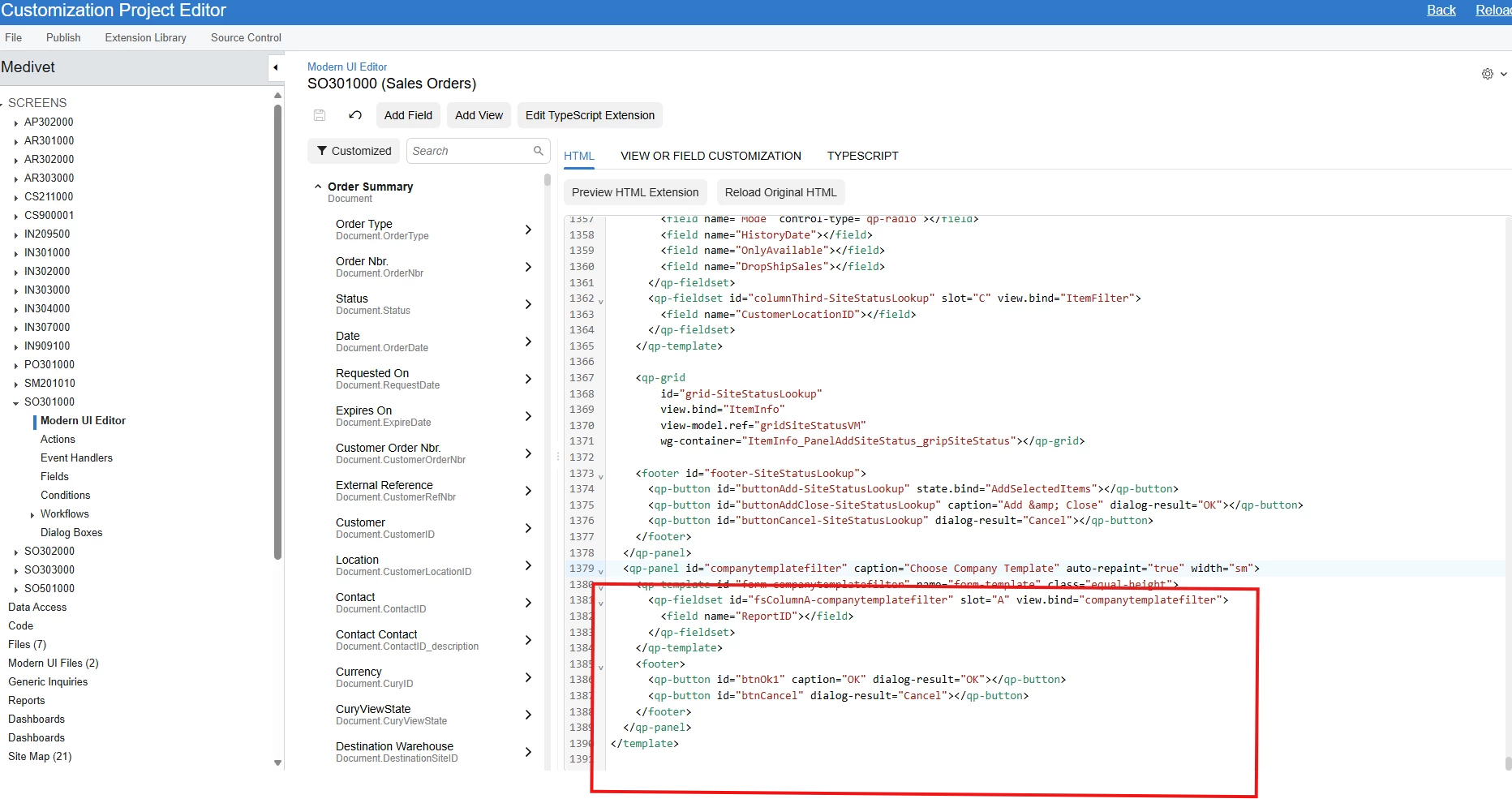 </px:PXSmartPanel> <px:PXSmartPanel runat="server" ID="PopUpReportFilter" Caption="Choose Company Template" Key="companytemplatefilter" AcceptButtonID="btnOk1" DesignView="Content" AutoCallBack-Command="Refresh" AutoCallBack-Target="fromRunSoReport" LoadOnDemand="True" AutoCallBack-Enabled="True" AutoCallBack-Behavior-CommitChanges="True" AutoCallBack-Behavior-PostData="Page"> <px:PXFormView runat="server" ID="fromRunSoReport" DataMember="companytemplatefilter" CaptionVisible="True" DataSourceID="ds" Width="100%"> <Template> <px:PXLayoutRule runat="server" ID="CstPXLayoutRule14" StartColumn="True" ControlSize="XM" LabelsWidth="S" /> <px:PXSelector runat="server" ID="CstPXSelector19" DataField="ReportID" CommitChanges="True" /></Template></px:PXFormView> <px:PXPanel runat="server" ID="CstPanel9" SkinID="Buttons"> <px:PXButton runat="server" ID="btnOK1" DialogResult="OK" Text="OK"> <AutoCallBack Command="Save" Target="fromRunSoReport" /></px:PXButton></px:PXPanel></px:PXSmartPanel>. I try to add customized field to modern ui it worked but only pxsmartpanel I don’t know how to do it. I go through developer note but I cannot find it.