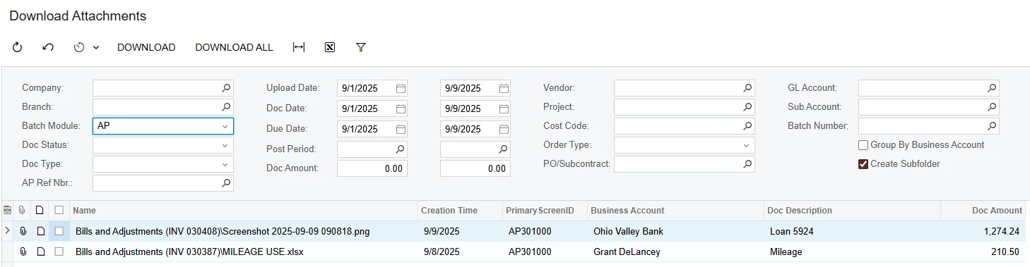 What we ended up doing was to create a Download Manger that allows the user to set its desired criteria and download attachments from AP/AR/Expense. This is the snippet of the screen which is offered as a ready to go small annual license package.