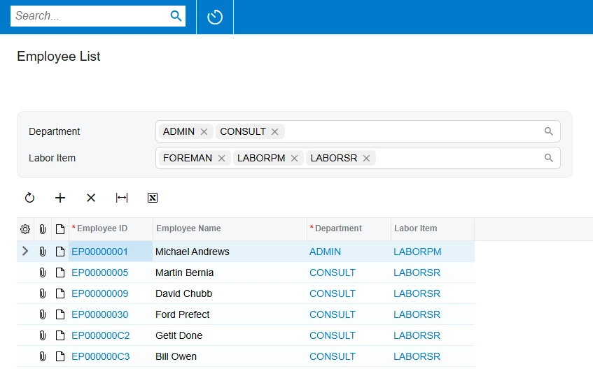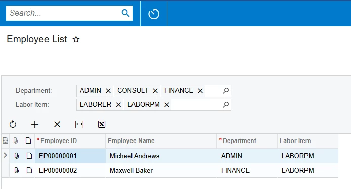 Let’s say we need to create a new screen that displays all employees, where we can filter results by Department and Labor Item (with the ability to select multiple values).