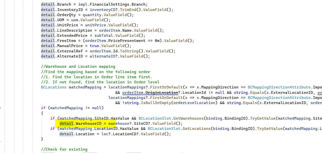 I’m trying to create a customization so that when orders get created from the acumatica commerce connector. I want too modify the Warehouse ID for specific stock items on “SP” order types.