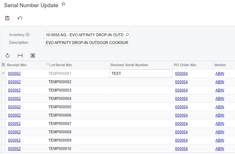 I have a custom screen I am using to attempt to update serial numbers in Acumatica. When the items are received, the customer doesn’t know the actual serial number at that time. We are autogenerating a TEMP number.