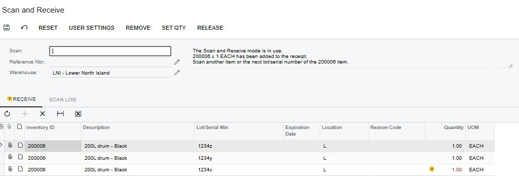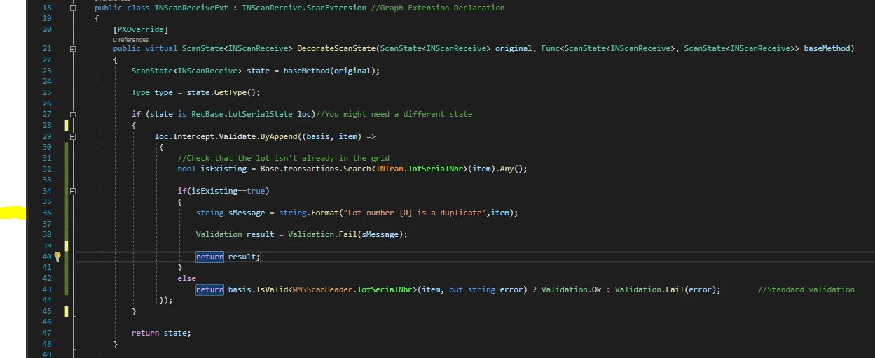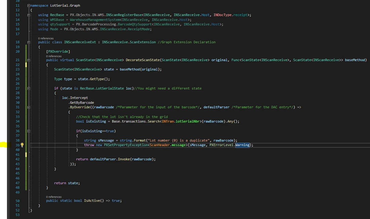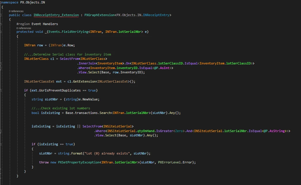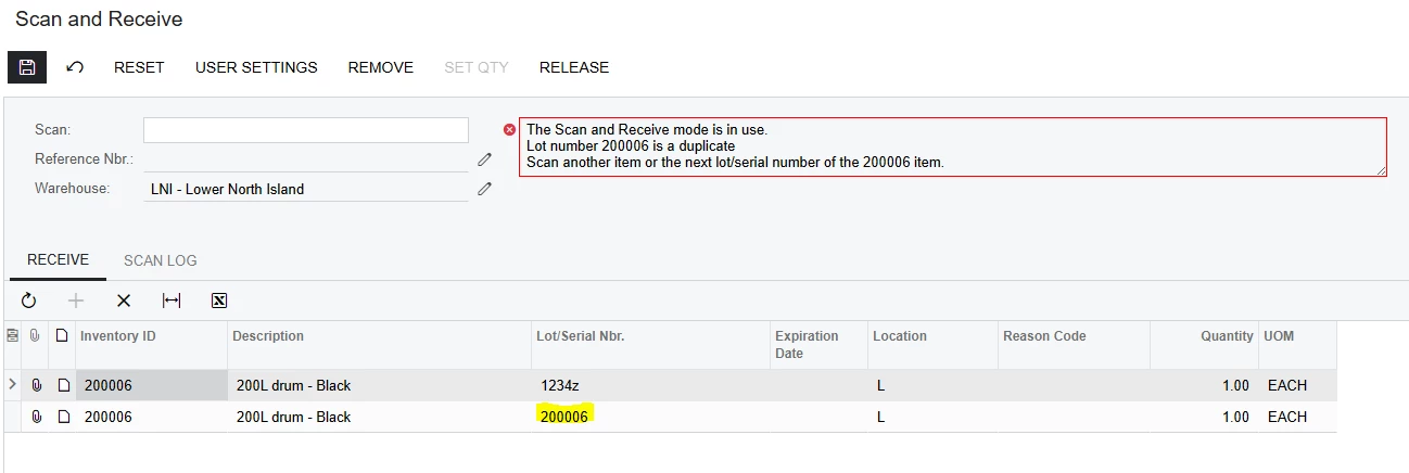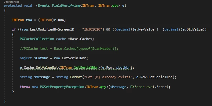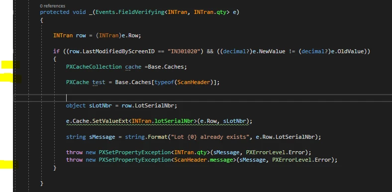 I have a customisation that is attempting to prevent duplicate lot numbers from being scanned on the mobile App (IN301020) and Receipts (IN301000)