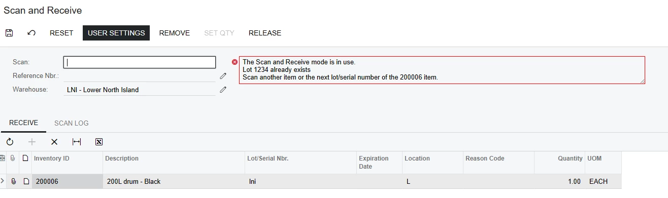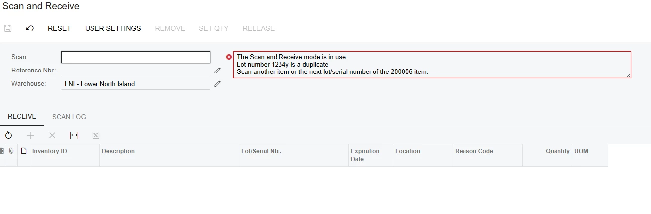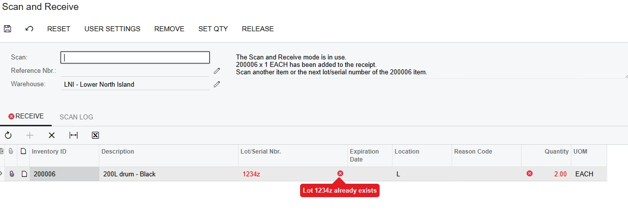 - The Lot number already exists on the unpersisted receipt.