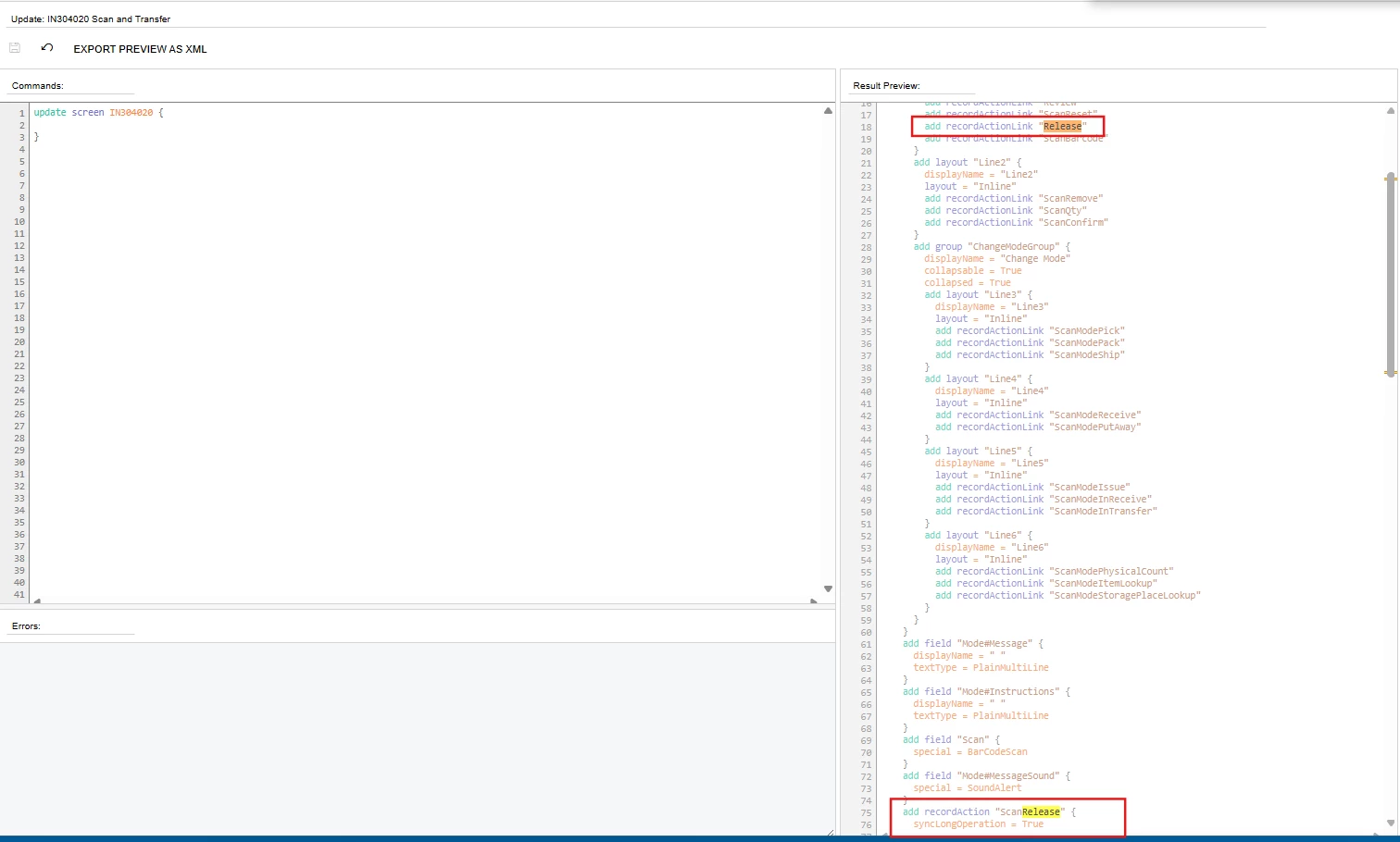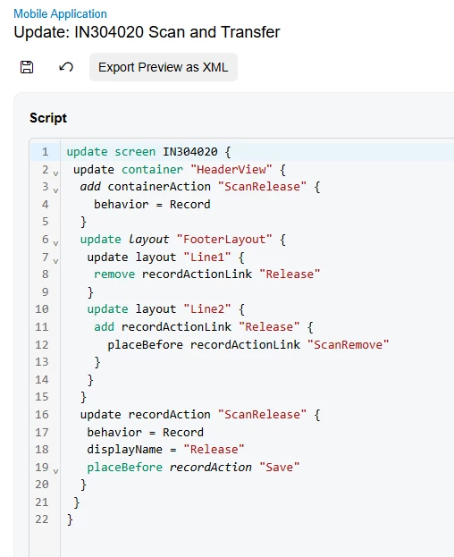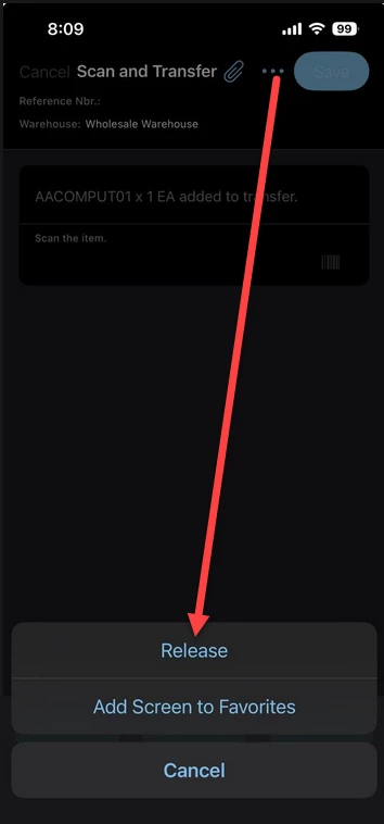 We have customized the mobile app for the Scan and Transfer screen. Currently, the Save action is displayed; however, our requirement is to show the Release action instead, once all the steps are completed.