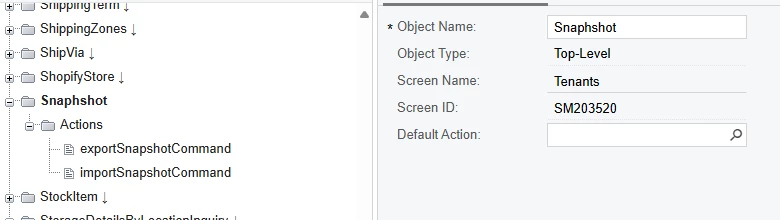 Similarly, I've created a customization project where I wrap the tenants screen in a custom screen then try to automate the snapshot creation from there. That process also successfully calls the exportSnapshotAction after prefilling the export parameters, but no snapshot is created.