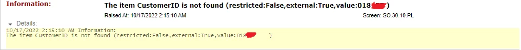 I’m trying to complete a order from SO but everytime i click the “complete order” nothing happened. When i look at error trace it shows that the “item CustomerID is not found (restricted:False,external:True,value:018*** )”.