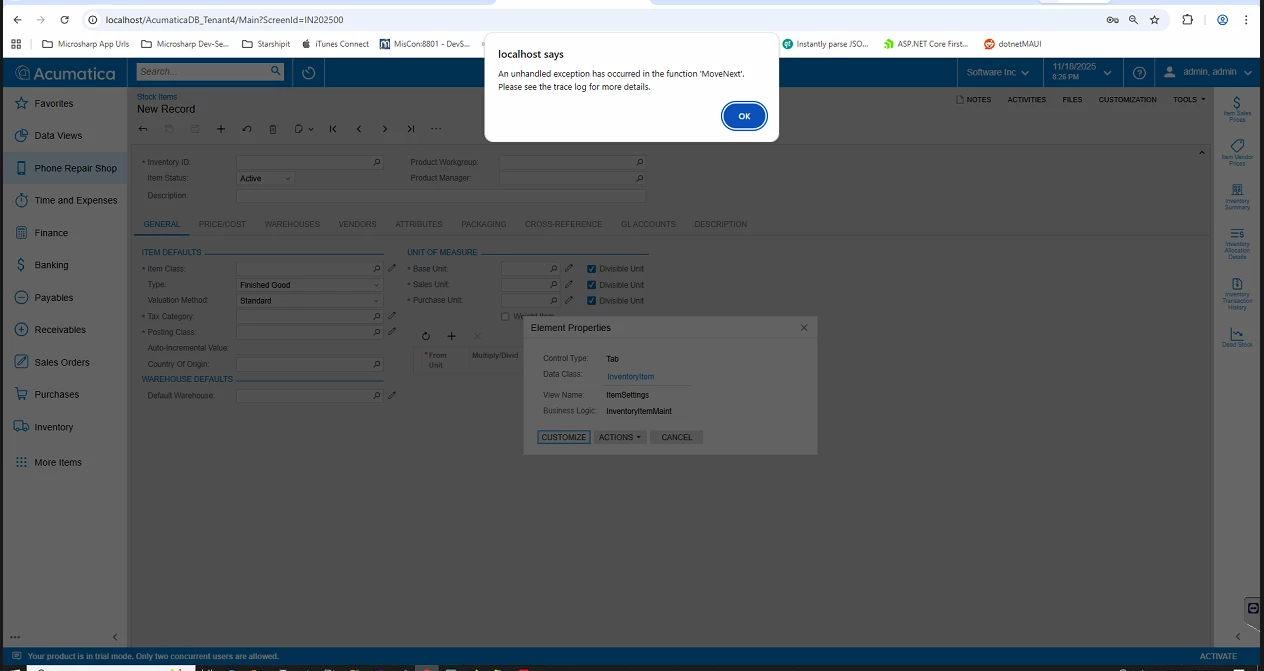 I am following same instructions for learning T190 course. I want to create custom field for Repair Shop, But when i follow same instructions, and go to click on Customize button, I am getting error below.