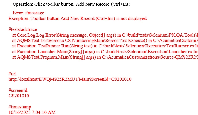 I have created a 25R2 Modern UI instance, added all 25R2-related dependencies into the automation framework, and created wrappers for CS201010 using 25R2 (ClassGenerator.exe.config). However, when I run the automation test script, the automation report shows errors, such as the “Add” button not being present, even though it is visible in the UI.