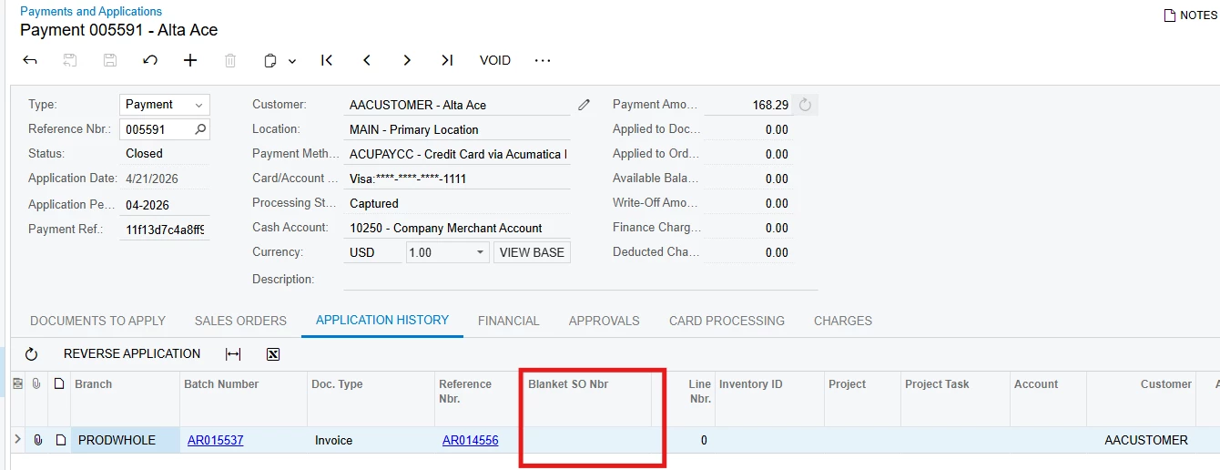 We have a requirement to add a custom field in the Application History tab of the Payments and Applications screen. This field should be populated from the Blanket Sales Order CustomerOrderNbr and must be updated during Payment Release and Payment Capture.