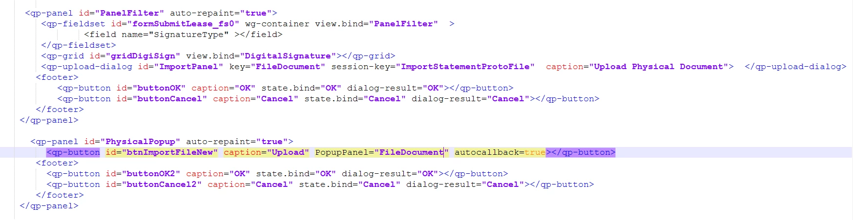 I am working in Acumatica Modern UI customization and I have a Smart Panel with an Upload button. When the user clicks the Upload button, a file upload dialog (<qp-upload-dialog>) should appear.
