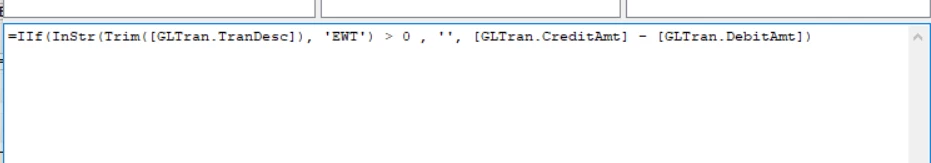 =IIf(InStr(Trim([GLTran.TranDesc]), 'EWT') > 0 OR [GLTran.TranDesc] = 'EWT FOR 4TH QTR 2022_DAP' ,'', [GLTran.CreditAmt] - [GLTran.DebitAmt])