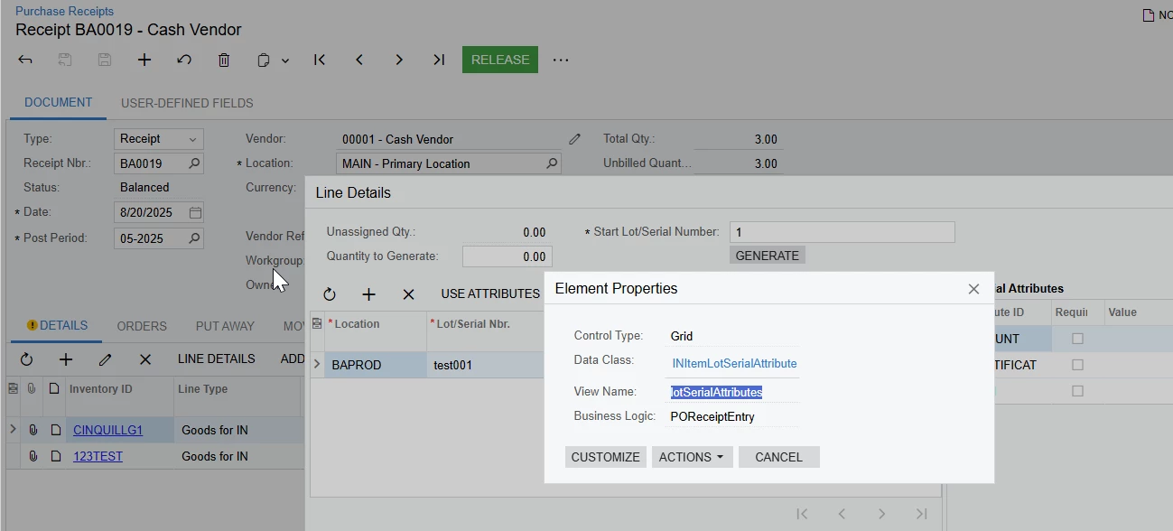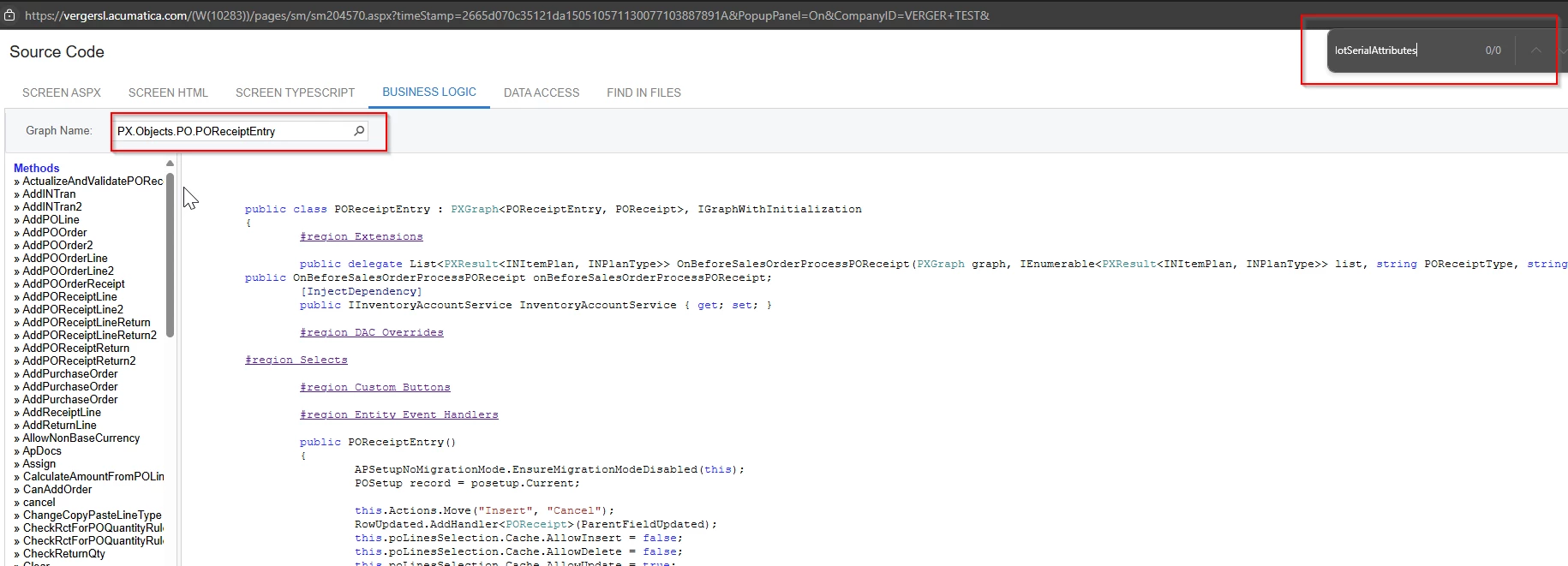 When I click Actions → View Business Logic and try to locate where lotSerialAttributes is defined, I’m unable to find it. I also opened the POReceiptEntry file in Visual Studio and searched there but still couldn’t locate the definition.