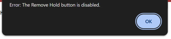 • After this, the button becomes disabled, and I get the error: “The Remove Hold button is disabled.”