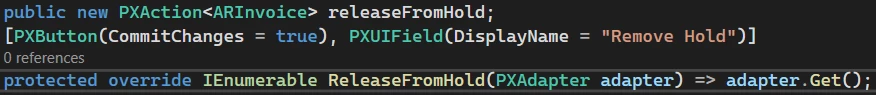 public IEnumerable ReleaseFromHold(PXAdapter adapter, ReleaseFromHoldDelegate baseMethod)