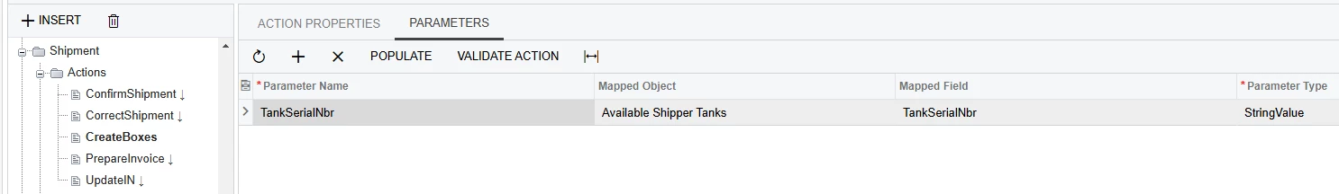 We have an action called createBoxes.  We’ve exposed this action as a REST API endpoint named CreateBoxes, mapping the TankSerialNbr parameter.