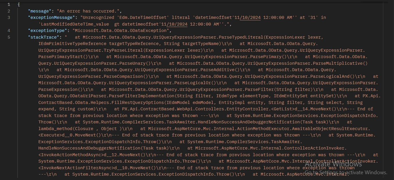 The error message is caused when I try to invoke the following endpoint also containing the filters required : {{endpoint_url}}ProjectBudget?$filter=LastModifiedDateTime_value gt datetimeoffset'11/10/2024 12:00:00 AM'