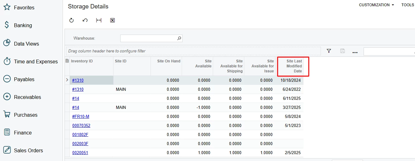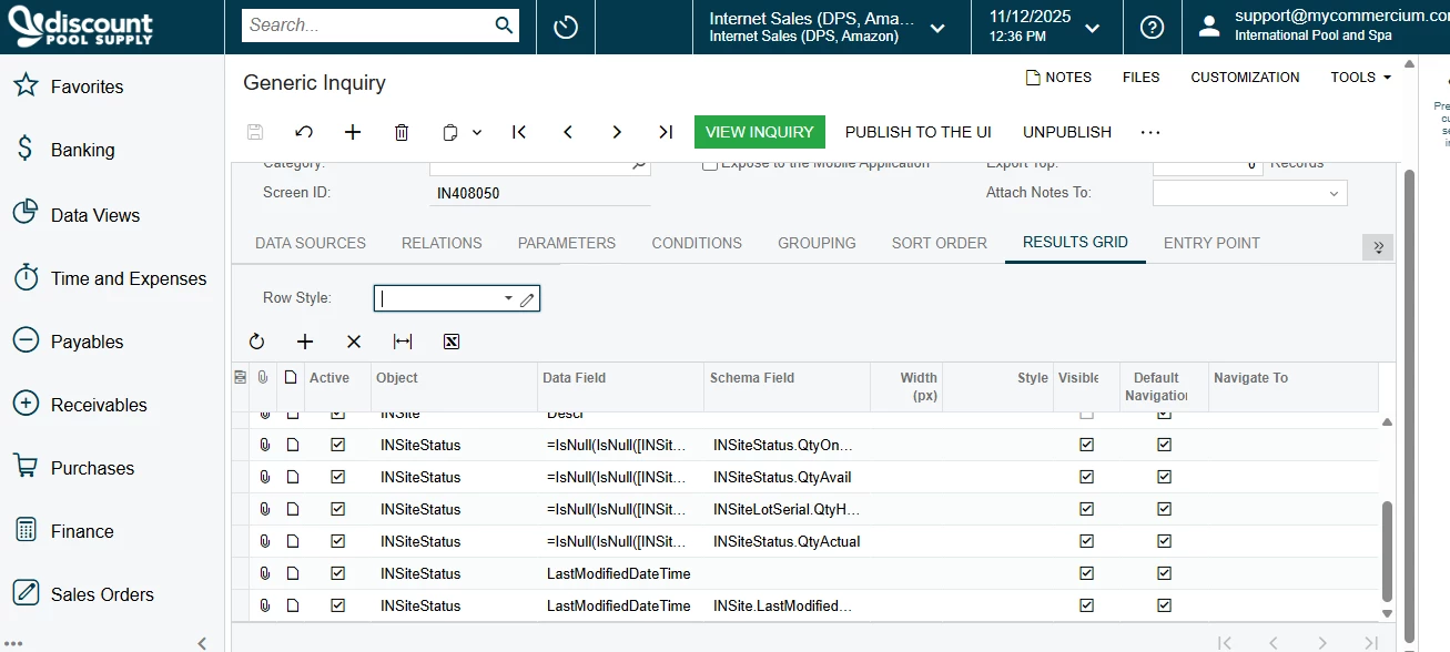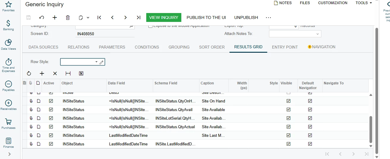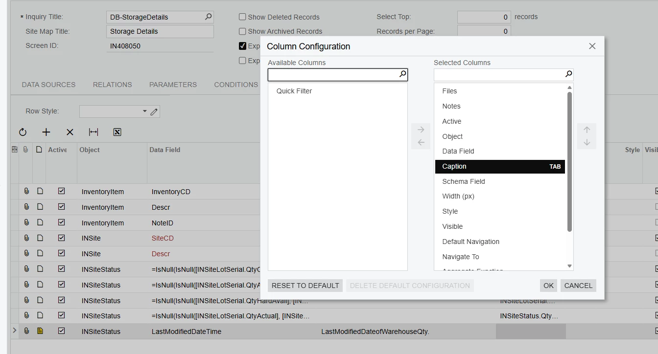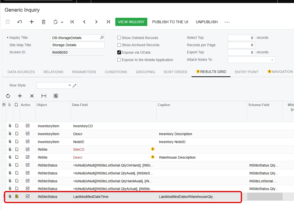 I’m working on a Generic Inquiry named “DB-StorageDetails” (Screen ID: IN408050) and trying to rename the column currently showing as “Site Last Modified Date” to “LastModifiedDateofWarehouseQty.”