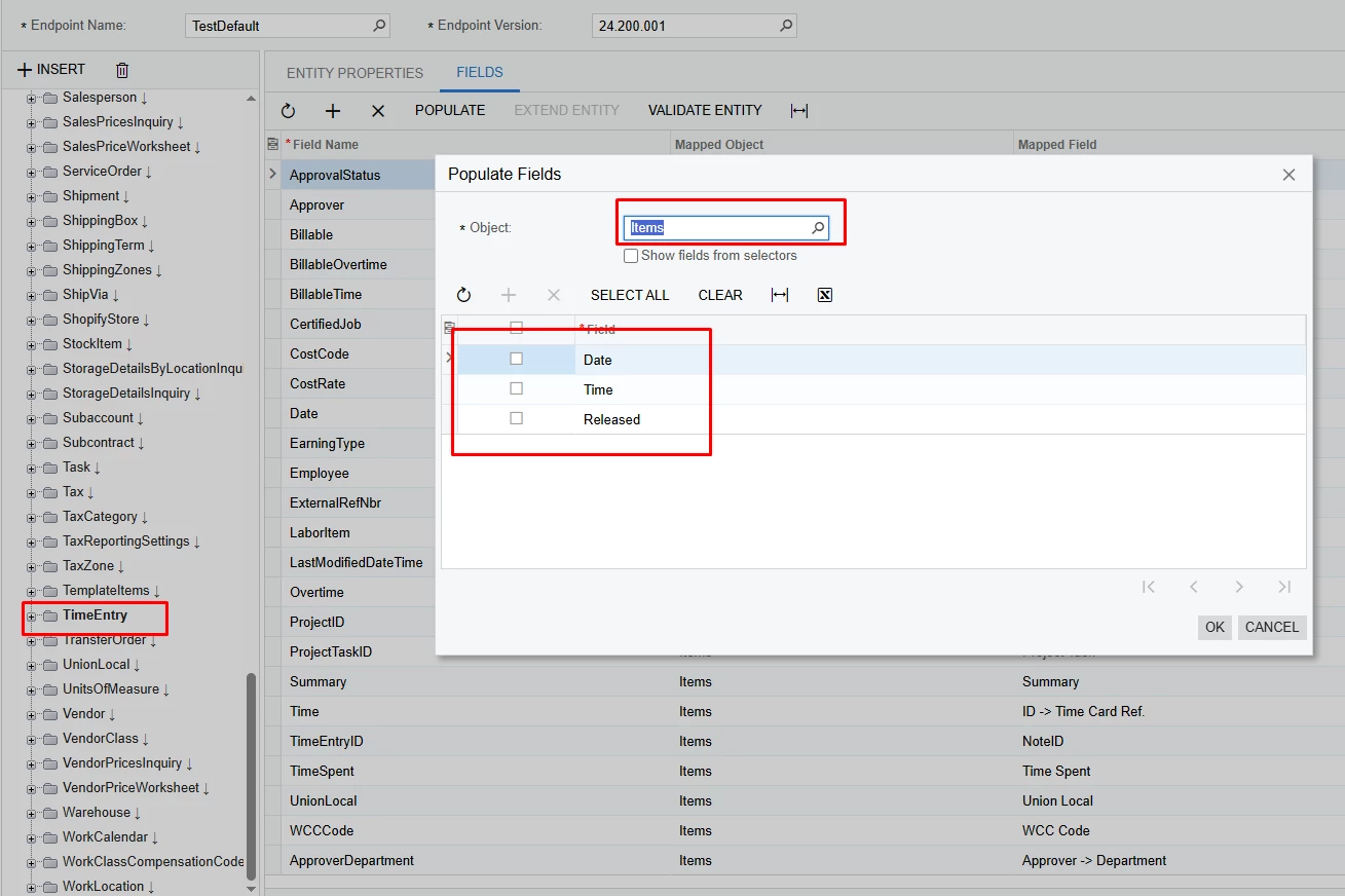- Issue: The `WorkGroupID` field is visible on the **Employee Time Activities** screen but is not available in the `TimeEntry` API payload. I checked the default and extended API contracts, but the field is missing.